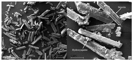- Le Corre, K.S.; Valsami-Jones, E.; Hobbs, P.; Parsons, S.A. Impact of calcium on struvite crystal size, shape and purity. J. Cryst. Growth 2005, 283, 514–522. [Google Scholar] [CrossRef]