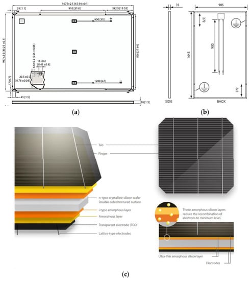 The technical parameters of each photovoltaic module technology under STC obtained from the manufacturer datasheets are mentioned in Table 2, and Figure 3 shows schematic diagrams or figures for these PV technology materials. The characteristics of the PV module include the nominal operating cell temperature (TNOCT) and the temperature coefficient of power or efficiency (β). The nominal operating cell temperature is the temperature of a module in a standard reference environment (SRE), which refers to an ambient air temperature of 20 °C, global solar irradiance of 800 W/m2 and wind speed of 1 m/s [15,32,33,34].