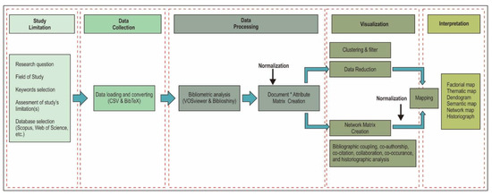 RStudio is an integrated development environment (IDE) for “R”. It includes a console, a syntax highlighting editor that supports direct code execution, and tools for planning, history, debugging, and workspace management. In this console, Biblioshiny can be accessed, which is then used to process library study data. Using Biblioshiny or VOSviewer requires databases with specific file extensions such as CSV and BibTeX. Figure 1 depicts a general flow of bibliometric analysis study methodology adapted from Aria and Cuccurullo (2017) and Firdaus et al. (2019) [35,50].