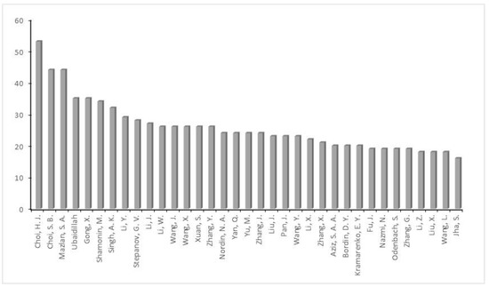 An author’s domination data were obtained by assessing the number of articles published and the citations received. The number of articles and citations can be seen based on the annual production and within a specified time [54]. The Biblioshiny tool was used in this bibliometric analysis to help determine an author’s track record in the magnetorheological materials field from 2013 to 2022. Figure 3 shows the results of each author’s bibliometric analysis related to this field. This is a record of the 35 authors with the highest number of article publications for the period 2013–2022. Choi, Hyoung Jin [55], from the Department of Polymer Science and Engineering, Inha University, Incheon 402–751, South Korea, has the highest number of articles. Based on Scopus data, Choi, Hyoung Jin published 828 articles on Scopus. These publications were dominated by the research topic “Nanofluidics; Rheometers; Electric Stimuli” in 52 articles, and “Magnetorheological Fluids; Liquids; Clutches” in 50 papers. This was in line with the results of the bibliometric analysis, in which Choi, Hyoung Jin’s research focus was in the area of magnetorheological materials. The next most significant number of scientific studies was attributed to Choi, Seung Bok [56,57,58] from the Industrial University of Ho Chi Minh City, Ho Chi Minh City, Vietnam. Choi, Seung-Bok has a comprehensive publication record of 845 articles, with 54 articles on “Magnetorheological Damper; Semi-Active Control; Damping” and 52 in the research topics “Magnetorheological Fluids; Liquids; Clutches.” The following highest contributor was Mazlan, Saiful Amri [59,60,61] from Universiti Teknologi Malaysia Kuala Lumpur, Kuala Lumpur, Malaysia. Mazlan, Saiful Amri mostly published research in the topics of “Elastomers; Insulators; Magnetic Field”, with 52 articles, and “Magnetorheological Fluids; Liquids; Clutches”, with 37 articles.
