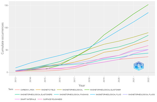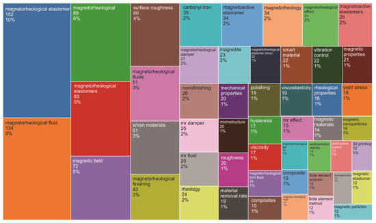 The keywords “magnetorheological fluid” and “magnetorheological elastomer” exhibited growth over the period. Figure 7 shows the development of keywords used by the authors in the field of magnetorheological materials. The key term “magnetorheological fluid” exhibited the most significant growth and was the most dominant. These keywords are, of course, in line with the many applications that use magnetorheological fluid as the working material, such as MR dampers. The MR damper keyword appears on treemaps and word clouds with a proportion of 2%. This is sufficient to provide additional explanations that influence the dominant use of the keyword “magnetorheological fluid”.