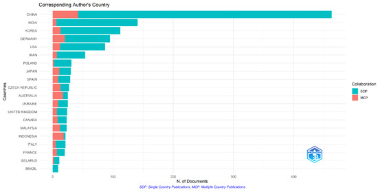 We next studied domestic and global collaboration events in the field of magnetorheological materials. The preliminary information obtained indicated that the collaboration index in the area of magnetorheological materials was 2.23. Based on the data processing results with Biblioshiny, 50 countries contributed to this field, dominated by China with a total of 463 articles. The articles were divided into 421 intra-country collaborations and 42 inter-country articles. The following most productive countries were India and Korea, as shown in Table 3 and Figure 8. Figure 8 shows a relatively significant difference between China and other countries. The difference between China and India in second position was 322 articles. India contributed one hundred and forty-one articles, with six collaborative inter-country articles and one hundred and thirty-five collaborative intra-country articles. The distribution of the collaboration map is also presented in Figure 9. The darker blue shows that the intensity of collaboration is increasing.