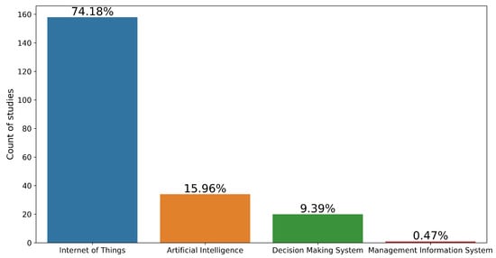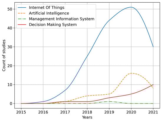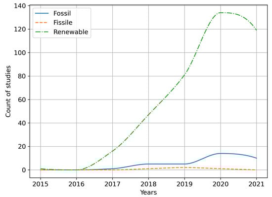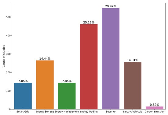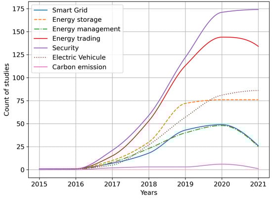 For the search words related to “energy”, we wanted to be very specific so as to collect papers related to “electrical energy” only and avoid irrelevant papers, such as, for example, papers dealing with mining energy in blockchain platforms. We combined these keywords by the logical operators AND and OR as shown in Table 1 in order to collect all papers that include at least keywords from each set either in their title, or abstract or keywords.