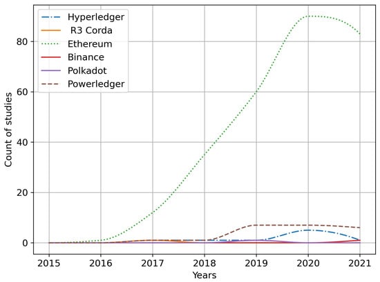 Another SLR that dealt with the use of blockchain technology in the energy sector is []. In this review, Wang et al. collected their primary studies between 2014 and 2019 in a single database: Scopus. This article was mainly about the use of blockchain technology in the expansion of renewable energies to reduce the need for fossil energies. However, the research questions that this SLR were addressing were not well defined, and the employed search methodology was not well clarified.