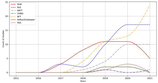 - Date range: We chose to start our paper selection from the year 2008—the year when the first blockchain application (Bitcoin) appeared—and end it at the year 2021, since this SLR was conducted at the beginning of 2022.