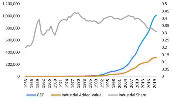 Since the founding of the People’s Republic of China, China’s economy has made remarkable achievements. Especially after the implementation of the reform and opening-up policy in late 1978, China has witnessed remarkable economic development. Industrial (Industry refers to the material production sector engaged in the exploitation of natural resources, and the processing and reprocessing of excavated products and agricultural products [1].) development has always been an indispensable part of China’s economic development: as shown in Figure 1, the share of industrial added value in GDP has steadily increased, from 17.6% in 1952 to more than 30% in recent years, and in some years, the share was even more than 40%.