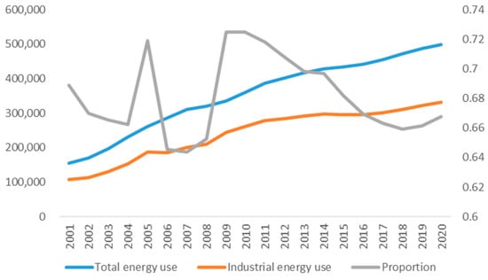 Proportion of industrial energy use in total energy use. Data source: National Bureau of Statistics of China [2].