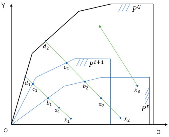 There is an obvious weakness of the traditional total factor productivity (TFP) that the TFP ignores a necessary part of production, that is, pollution emission. Thus, some scholars introduced pollution emission together with capital, labor, and energy consumption into production function as inputs [24,25]. However, the output characteristics of pollution emission make it unreasonable to regard it as input. In order to correctly fit the impact of environmental pollution on economic growth, Chambers et al., Chung et al., and Fare et al. successively established the directional distance function (DDF) [26,27,28]; in particular, Chung et al. proposed the Malmquist–Luenberger index calculated by DDF, which includes pollution emission as unexpected output in the total factor productivity accounting framework and estimates green total factor productivity (GTFP) [27]. However, there is a possible problem of infeasible solution when calculating the ML index. As shown in Figure 3, the directional distance function of t year may have no intersection with the frontier of t + 1 year due to rapid technological innovation. In Figure 3, , and represent DMUs (decision making units; in this study, they represent the annual situation in different cities) in the year of t, while and represent DMUs in the year of t + 1. The blue lines represent the frontier of t and t + 1 year, the green lines represent the directional distance function, and the black line represents the global frontier. In order to deal with this problem, Oh proposed a global Malmquist–Luenberger index (GML) [29]. It could overcome the infeasible solution of ML index and satisfy circularity by considering the global frontier. The GML index is a positive number. If the index is greater than 1, it means that the industrial production efficiency in year t + 1 is higher than that in year t. If the index is equal to 1, it means that the industrial production efficiencies in two years are equal. If the index is less than 1, it means that the industrial production efficiency in year t + 1 is lower than that in year t.