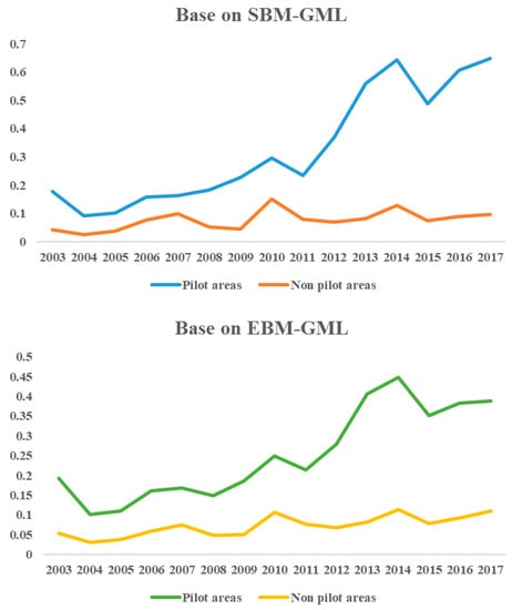 In Table 3, the first and second columns present the average GML index based on SBM model for all the cities in pilot areas and non-pilot areas. The third and fourth columns present the average GML index based on the EBM model for all the cities in pilot areas and non-pilot areas. Comparing the GML indexes in pilot area and non-pilot areas, this study showed that in 2013, the GML indexes in pilot areas were obviously larger than those in non-pilot areas, whether the indexes are based on SBM model or EBM model. This means that in pilot areas, the green total factor productivity in 2013 has changed a lot compared to 2012, while in non-pilot areas, the change in green total factor productivity is not so obvious between 2012 and 2013.