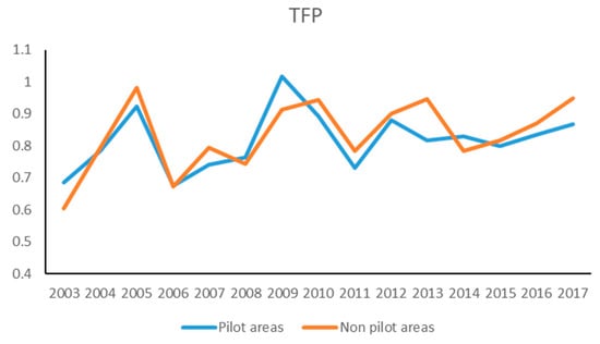 In order to further test the impact of carbon emission trading scheme on the green production of industrial enterprises, we also studied the impact of carbon emission trading policy on total factor productivity of industrial enterprises. Thus, industrial TFP will be considered as the dependent variable in this section. The results of TFP are shown in Figure 5; the variation trends of TFP between pilot areas and non-pilot areas are similar.