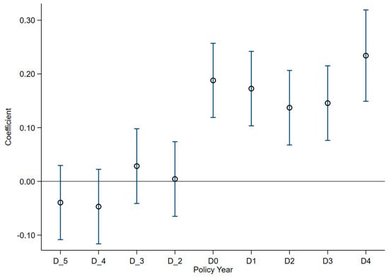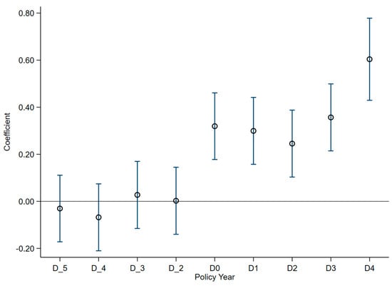 In Formula (10), for the provinces or municipalities in the treatment group, if the time is j years after the implementation of the policy, = 1, otherwise = 0. In the control group, D is always equal to zero. For instance, Beijing implemented an ETS policy in 2013; for Beijing in 2011, = 1, and = 0 in other years in Beijing; for Beijing in 2014, = 1, and = 0 in other years in Beijing. While Hubei has implemented an ETS policy in 2014, for a city in Hubei in 2012, = 1, = 0 in other years in Hubei. The results are shown in Figure 6 and Figure 7.
