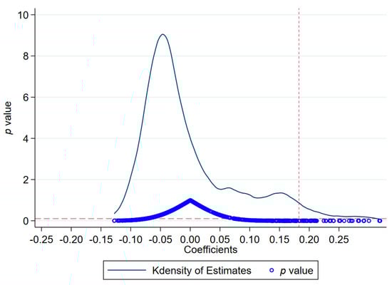 Figure 8 and Figure 9 show the distribution of the estimated coefficients of 1000 hypothetical policy dummy variables and their corresponding p values. Among them, Figure 8 is based on SBM-GML model, while Figure 9 is based on the EBM-GML model. The x-axis represents the size of the estimated coefficients of hypothetical policy dummy variables, the y-axis represents the density value and p value, the curve is the kernel density distribution of the estimated coefficients, the blue dot is the p value corresponding to the estimated coefficients, and the vertical dotted line is the real estimated values of the DID model, which are 0.3484 and 0.1827. Finally, the horizontal dotted line represents a significance level of 0.1.