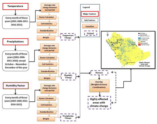 The climate change rates were computed for each month of those years independently (2001, 2006, 2011, 2016, and 2021). The average rate of climatic change for each month was then calculated using the output in conjunction with cell information. The output raster was then classified (using a geometrical interval), where 1 represents the least change and 5 represent the greatest change rate of climatic change for each month. Finally, the weighted overlay was assumed equal weight for all three sub-models. Each sub-reclassification model’s outputs are multiplied by weights based on how important the other sub-models are and all of the sub-models are then joined together to create the climatology model. The risk map of the climatology model was produced and then transformed into a vector layer in order to compute the areas of risky zones in km. The suggested model and the datasets that were used are shown in Figure 4.