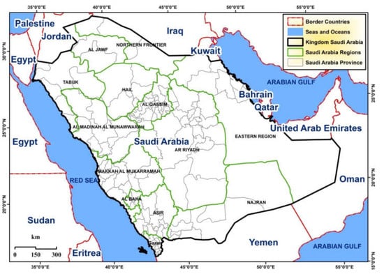The Kingdom of Saudi Arabia is located in the far southwest of Asia, surrounded to the west by the Red Sea, to the east by the Arabian Gulf, to the north by the United Arab Emirates and Qatar, to the south by Iraq and Jordan, and to the north by the Sultanate of Oman [26]. The Kingdom of Saudi Arabia, with an area of over 2,000,000 km2, accounts for almost four-fifths of the Arab Peninsula (see Figure 2).