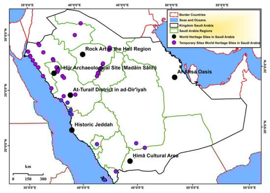 Saudi Arabia has split administratively into 13 emirates, each subdivided into a number of governorates and centers. Saudi has a distinctive and varied history in addition to recent towering buildings. Most world heritage sites are in Medinah, Hail, and Tabuk. Six heritage sites in Saudi Arabia were recorded in World Heritage Sites (WHS) between 2008 and 2021 named Al-Ahsa Oasis, Al-Hajar Archaeological Site (Madain Saleh), Al-Turaif District, Historic Jeddah, and rock art in the Hail area. Additionally, there are 10 designated World Heritage temporary sites, which are mentioned in Table 2 and depicted in Figure 3.