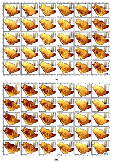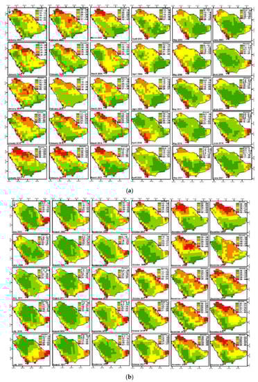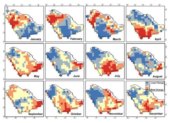 The most obvious parameter that will change as greenhouse warming continues is temperature. Figure 5a,b shows the results of an analysis of the monthly temperature range for each month of the year in Saudi Arabia from 2001 to 2021. The months with the highest average temperatures were June and July of 2001, which reached, 62 °C and the months with the lowest average temperatures were January of 2006 and 2011. Figure 6a,b show climate changes at the monthly level every five years, whether declining or rising. The rate of change divided into five categories, negative change and positive change ranging from less than 5% to 20%. The highest rate of change in average temperatures were recorded in April (2011–2016) and December (2006–2011 and 2011–2016) at the northeastern and southeastern parts of Saudi Arabia, while decreasing changes occurred in December (2001–2006) and April.