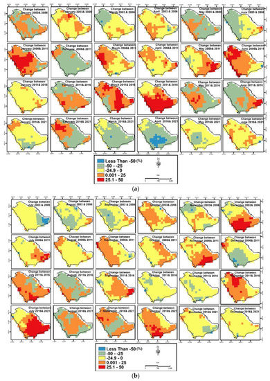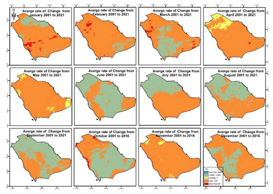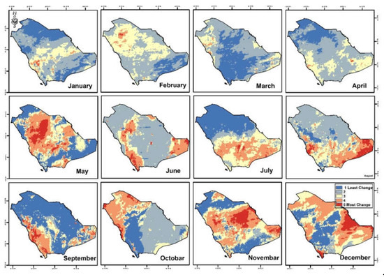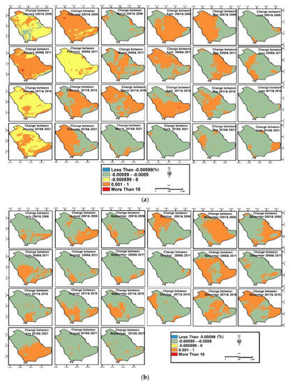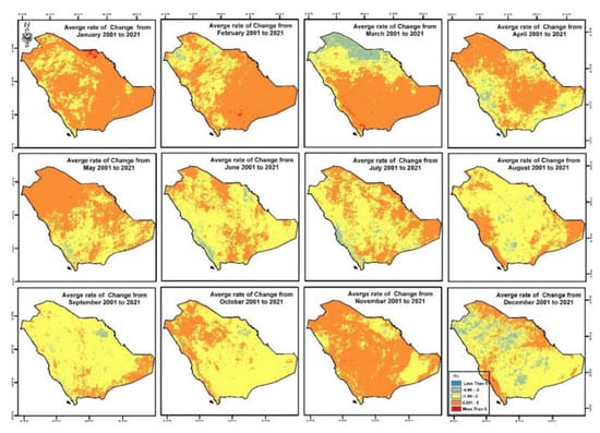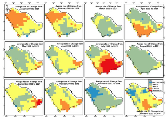 The changes of rates (5 years’ time interval) were recorded at the south, southwest, and southeast parts in January (2006–2011), April (2011–2016), and July (2016–2021) (see Figure 14a,b). Figure 15 shows the monthly change rate over 20 years, where the higher change rate values were in July and the lower were in November.