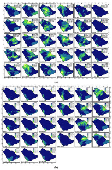 Precipitation may have potential consequences for human culture and ecosystems, thus, much research has been conducted to study responding of high precipitation to climate change [31]. Figure 9a,b depict the distribution of rainfall in Saudi Arabia from 2001 to 2021 in winter and autumn. The rainfall rates vary from 0.655 mm/h to 0.00000914655 mm/h and the heaviest precipitation was in July 2021, on the southwest parts of the country followed by July and August 2001 on the west parts, with average monthly rainfalls of 0.50655 mm/h and 0.45655 mm/h, respectively. Figure 10a,b depict the variance in the average rates of change in rainfall at the monthly level over a period of twenty years. The categories of change rates have been split and consolidated into five groups, ranging from −0.00099% to 10%. The highest rates of change occurred in February between 2001 and 2006, as it reached more than 10% in the north of Saudi Arabia. It was recognized that the rate of change was high at time interval January (2006–2011).