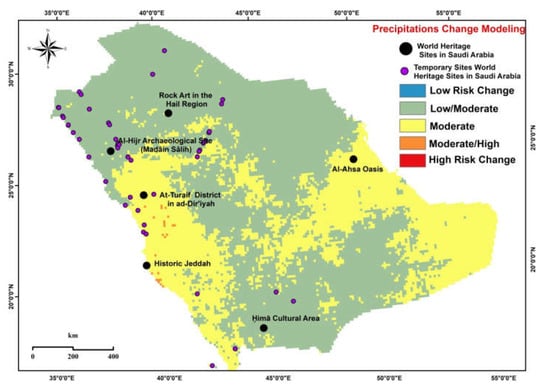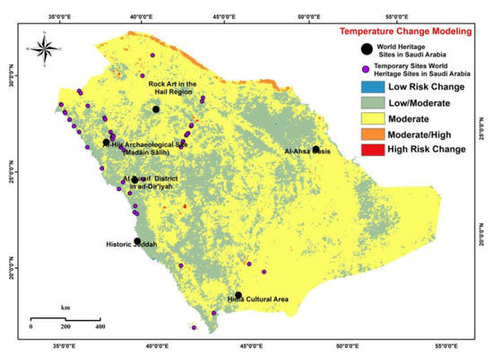During the last twenty years, the heritage site locations were within the range of moderate risk temperature changes (Al-Ahsa Oasis, Al-Turaif District, Al-Hajar Archaeological Site, Historic Jeddah, Rock Art in Hail). The majority of Saudi Arabia, with an area of 1,554,409.40 km2 and 67.02%, was within the moderate risk category. The temporary world heritage sites were in moderate to low‒moderate risk changes.