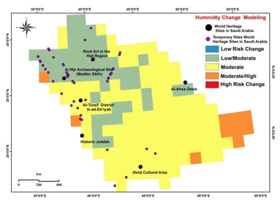 Only three risk categories (moderate/high, medium, and low/moderate) for humidity change were shown in Figure 19 and Table 5. Heritage sites such as the Al-Hajar Archaeological Site and Rock Art in the Hail region of Saudi Arabia were found in the low moderate-risk category. The northern and central portions of the country were in the class of low/moderate risk of changes with an area of 657,157 km2 and a rate of 28.33%.