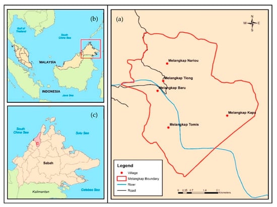 Location of Melangkap Village situated in Kota Belud District. (a) The Melangkap Village consists of five small villages, namely, Melangkap Tomis, Melangkap Tiong, Melangkap Kapa, Melangkap Nariou, and Melangkap Baru; (b) Sabah is located in East Malaysia; (c) Melangkap Village is in the Kota Belud District. Source: [60].