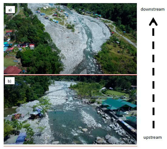 Landform changes of the Panataran Kedamaian River after the disaster. (a) A row of chalets built on an island; (b) The formation of a wide, sloping, and airy riverbank area (point bar) in the upstream part of the island further enhances the aesthetic value of the region.