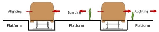 - Seriani, S.; de Ana Rodríguez, G.; Holloway, C. The combined effect of platform edge doors and level access on the boarding and alighting process in the London Underground. Transp. Res. Rec. J. Transp. Res. Board 2017, 2648, 60–67. [Google Scholar] [CrossRef]