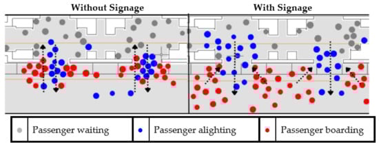 In relation to the “get off before getting on” behavior, the use of this signage effectively reduced the number of interactions at all levels of the platform configurations. Its effect was more evident in stations with a platform design that only allowed the use of a row of train doors for interchange, being slightly greater in stations with a central platform. The effect in the mixed platform model was considerably less than in the other platform topologies, but still significant. The different platform configurations showed different performances in the number of interactions when the signage was used or when it was not. The central configuration was the least optimal, followed by the lateral platform. The most effective was the mixed platform. In particular, it is striking how the interactions between passengers changed when signaling is applied to the stations. In the case of signage, not only did close encounters between pedestrians decrease, but also the number they were reduced to is practically the same. This is a great point in favor of the factor that induces the “get off before getting on” behavior, since it shows that it makes any type of station just as efficient in the case of needing to reduce interactions between passengers, as it is in a context of pandemic.