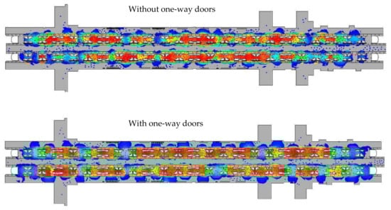 Using Minitab’s Response Optimizer tool (see Table 9), we sought to find the best treatment that minimized the proximity count. The mixed model without using one-way doors is the most beneficial solution in this metric. It was concluded that the use of one-way doors does have a significant effect on the proximity count, but it tends to increase, especially in the mixed model. This means that it does not contribute to improving the level of service for passengers. Its contribution to other aspects is not ruled out, which may be studied in further simulations.