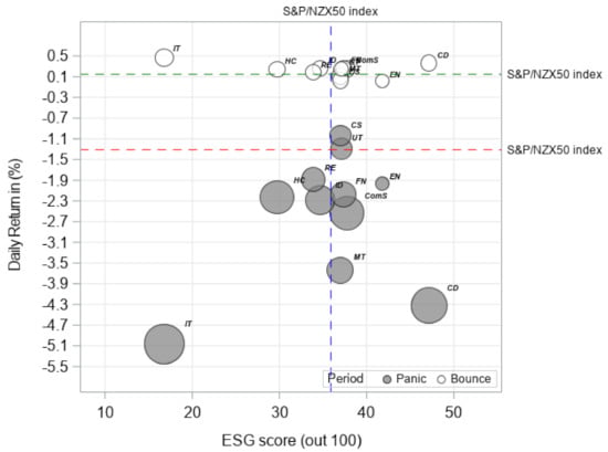 Note: The two horizontal lines correspond to the average annual return of S&P/NZX 50 companies for the corresponding phase of the pandemic. The vertical line indicates the average ESG score for 56 listed companies with ESG scores. The abbreviations are defined in Table 1.