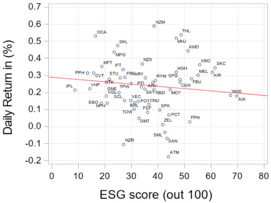 The scatter graph illustrates the relationship between the daily average performance of 56 NZX-listed companies during the 26 March 2020–19 January 2021 period and their ESC scores proxied by Refinitiv’s ESG Combined Scores.