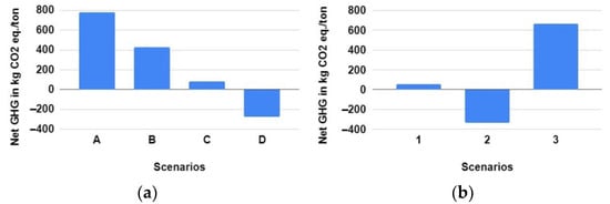 | Scenario | Energy Recovery (106 kWh/y) | GHG Emissions, kg of CO2 eq/tons | Avoided CO2 Emissions as a Result of Energy Recovery, kg of CO2 eq/tons | Net GHG Emissions, kg of CO2 eq/tons |