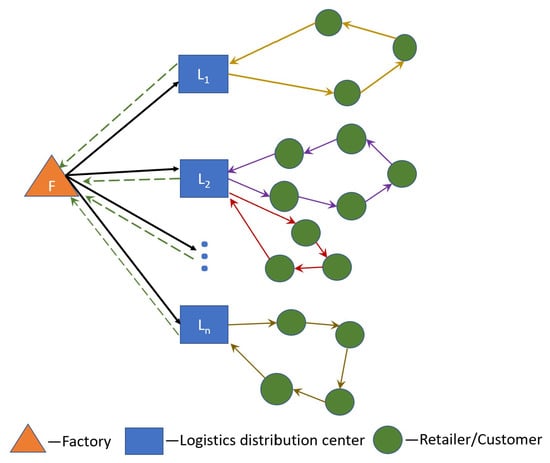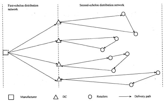 There has been significant development of networks and logistics, which has seen logistics distribution receiving increasing attention and development. For a long time, logistics management mainly focused on the location selection of distribution centers (DCs), inventory control, and vehicle routing arrangements. These three factors are classified according to the strategic, tactical, and operational levels of a logistics system. Therefore, modern logistics enterprises need to make decisions: firstly, the location of the DCs; secondly, the optimal inventory of these DCs; and finally, on the route through which vehicles carry the goods to the customers. A standard network structure is shown in Figure 1.