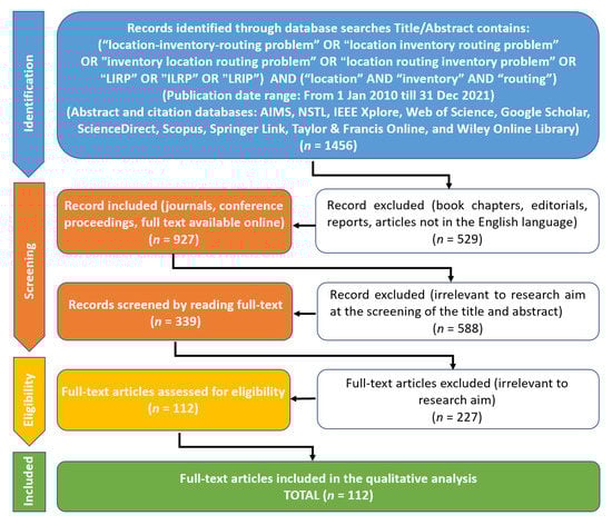 In PRISMA, research objectives and problems, keywords, and a set of inclusion and exclusion criteria are developed. In this paper, we evaluate these criteria based on the problem characteristics, data types in demand, model-based solutions, and application fields of LIRP. In addition, location, inventory, and routing are treated as equally important. This results in the selection of “location-inventory-routing problem” OR “location inventory routing problem” OR “inventory location routing problem” OR “location routing inventory problem” OR “LIRP” OR “ILRP” OR “LRIP” as the search keywords. We use search terms (such as “location” AND “inventory” AND “routing”) in database searches to make sure the search focused on the literature related to mathematics and computer science, particularly pattern formulation, rather than social-science-related research in supply chain logistics.