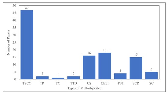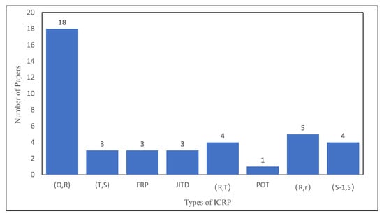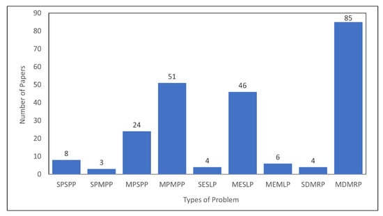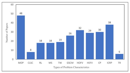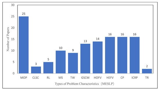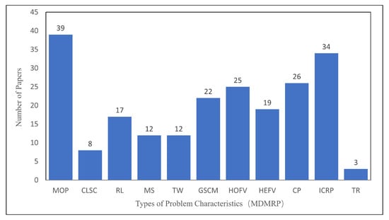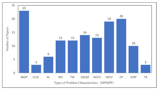 In this subsection, the selected literature is grouped and classified. Table 5 gives the classification of the LIRP. This classification is divided into four different categories. The first category is problem characteristics, which is further divided into three subcategories according to inventory, route, and logistics of DCs. First, based on inventory characteristics, Refs. [32,33] proposed a classification of the number of periods and products (P-P). For this variant, there are four different subcategories representing single-period single-product (Single-Single), single-period multi-product (Single-Multi), multi-period single-product (Multi-Single), and multi-period multi-product (Multi-Multi). Secondly, Ref. [34] focuses on the echelons of supply chain management and the quantity classification of links between customers, which can also be divided into three subcategories. They are single-echelon single-link (Single-Single), multi-echelon single-link (Multi-Single), and multi-echelon multi-link (Multi-Multi). Thirdly, Ref. [34] also studied the number of depots (or DCs) and the quantity classification of retailers (or customers) in supply chain management. This can be divided into two subcategories: single-depot multi-retailer (Single-Multi) and multi-depot multi-retailer (Multi-Multi).