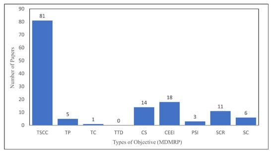 As for the review of LRP, Ref. [15] defined the standard LRP as a deterministic, static, discrete, single-echelon, and single-objective problem in which each customer (vertex) must be visited once for the delivery of a good from a facility, and there is also no correlation with inventory decisions. A review of the LRP literature from 2006 to 2014 is presented following the classification of variations on this problem, providing readers with concise excerpts of papers to convey the central ideas of each work and discussing the latest developments in the field. In addition, Ref. [16] conducted a review study, and the selected LRP articles are divided into five main categories: (a) research type, (b) deployed solutions, (c) problem scenario characteristics, (d) problem physical characteristics, and (e) the objective functions considered in the model. Each item had subcategories, among which the subcategories of (d) and (e) followed the classification of [15]. Some of these specifications are reviewed in this paper.