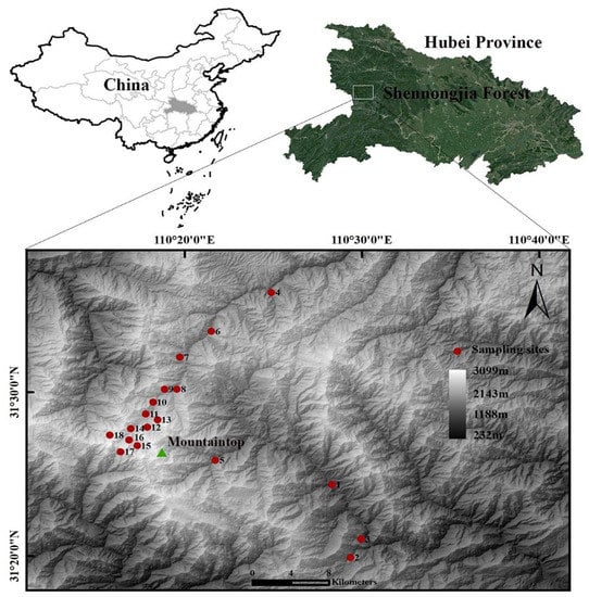 - Zhao, C.M.; Chen, W.L.; Tian, Z.Q.; Xie, Z.Q. Altitudinal pattern of plant species diversity in Shennongjia mountains, central China. J. Integr. Plant Biol. 2005, 47, 1431–1449. [Google Scholar] [CrossRef]