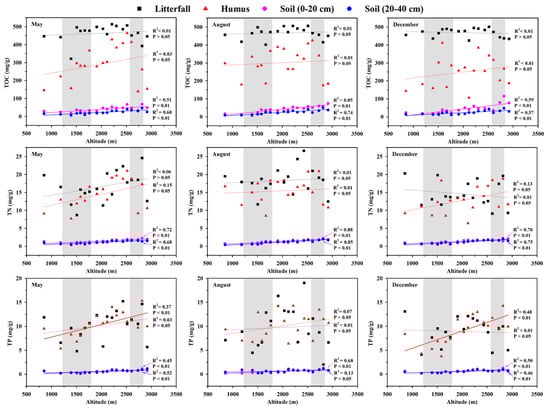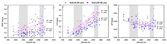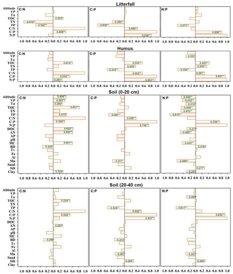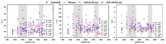 3.2. Response of C, N, and P Contents and Their Stoichiometry to Altitude
