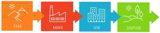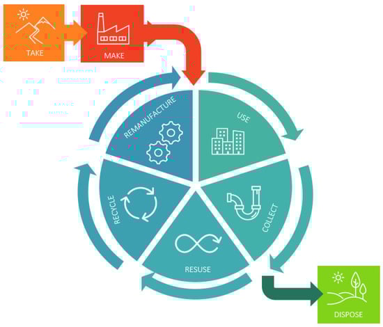 The economic model that governs our society is a linear and unidirectional model, in which natural resources are extracted from the environment and then used as raw materials for different products, which are consumed and then discarded. The premise of this “extract, produce, use, dispose” model (Figure 1) is that natural resources are abundant, easily accessible, and affordable to manage as waste []. However, the dynamics of this model are neither sustainable nor feasible in the long term [] because of the short life cycle of the products; the high demand for resources, which in many cases are limited; and the pollution generated by the immense amount of generated waste.