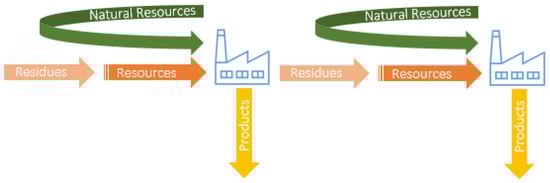Linked to the concept of industrial symbiosis are so-called eco-industrial parks [], which represent the practical application of industrial symbiosis. Although this has various definitions, the fundamental idea in all of them is the same, referring to the development of a business community with material exchange networks in which the by-products or waste of a company or industrial process are converted into products that can be reused by other processes, reducing the number of required raw materials and the waste generated (Figure 3). This, together with the shared use of infrastructures, services, information, or other logistical aspects, leads to a more sustainable consumption and production system [,].