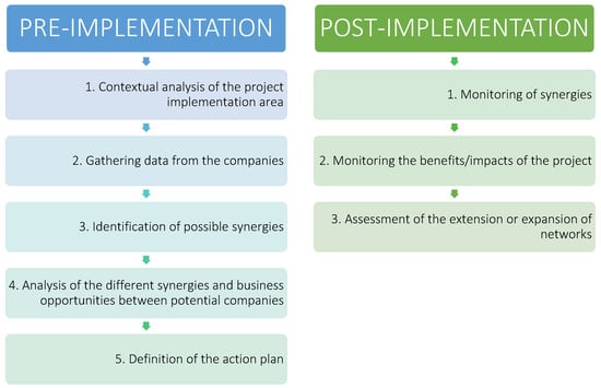 Therefore, in order to face the situations mentioned above and to guarantee the development of industrial symbiosis networks, one solution may be to design industrial symbiosis projects in a premeditated and planned way. In the implementation of industrial symbiosis projects, the following phases can be distinguished (Figure 4).