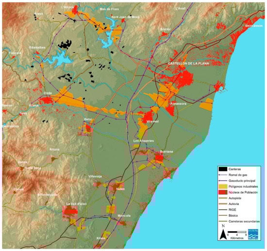 Distribution of industrial parks and quarries in the province of Castellón. Source: Valencian tourist landscapes, valuable and valued (http://paisajesturisticosvalencianos.com/paisajes/la-industria-ceramica-de-la-plana/ accessed on 8 June 2022).