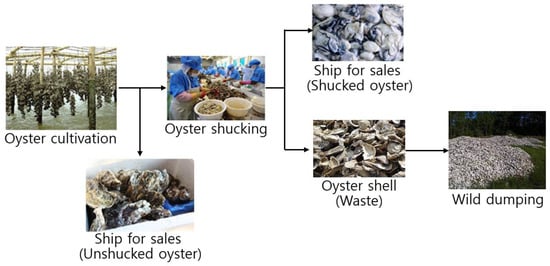Figure 1 illustrates the process of oyster shell generation. Oysters are sold in shells as products, but most are shipped out in flesh form after going through the shucking process. Therefore, unlike other shellfish, oysters produce a large amount of shellfish waste. As per the status of oyster shell management in Korea in 2017 [26,27], only about 53% of the shells separated during the shucking process are recycled as fertilizer or for seedling collection, and about 100,000 tons of shells are not utilized, but instead stored (75,000 tons, 26% of total generated amount) or abandoned (24,000 tons, 8.4% of total generated amount). Moreover, the amount of shells recycled as fertilizer has decreased by about 58% compared with 2011, and the amount of abandoned shells is increasing every year [27]. Most shells that are not recycled are abandoned on the coast, which is the main culprit of environmental pollution in coastal areas. Thus, a proper management plan for oyster shells is urgently needed, with oyster generation increasing every year.
