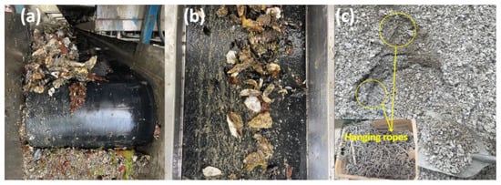 Photographs of oyster shells (including impurities) during the shucking process. Shucked oyster shells were conveyed (a,b) to a crusher and then dumped in the shell yard (c). Aquatic debris such as kelp, seaweed, and soils are discarded together with oyster shells during the shucking process.