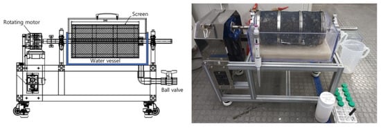 To observe the washing characteristics, a screening device was designed and manufactured as shown in Figure 3. We constructed this device by applying a simulated typical trommel with a 1 mm mesh net. The screen had an inside diameter of 150 mm, length of 300 mm, and effective volume of 7 L in total. In the washing process, about 1 kg of shell was loaded into a trommel, and 4 L of washing water was poured into the water vessel so that about 15% of the total volume of the screen could be submerged. The trommel was operated at a speed of 20 rpm. In order to confirm the removal of impurities during the operation of the trommel, washed shell and water samples were collected from inside and outside the screen according to the washing time.