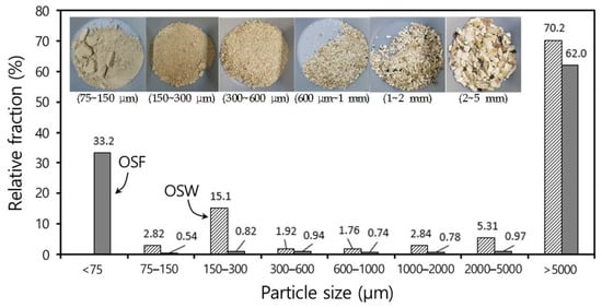 A particle size analysis was performed using a wet method, as impurities were tangled and adhered to the surface of the shell. We placed approximately 300 g of dried shell into sieves, with particle sizes ranging from 75 μm to 5 mm, and washed them with tap water. We then measured the amount of recovered dried shell filtered through each sieve size. For the particle analysis, the average value was used by repeating the process twice for each shell sample.