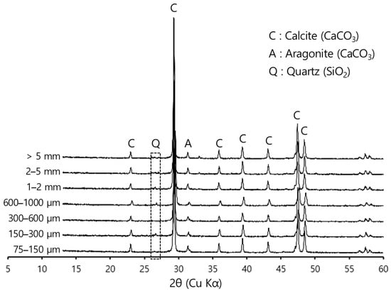 Analyzing the results of the particle size distribution for the shells collected from the two different sites, it was found that the contents of the coarse granules (>5 mm) were not different (Figure 4). However, the fine particles with sizes less than 75 μm from OSW were characterized by a 30% or higher content compared with those from OSF. The shells separated in this way also showed visually different characteristics (photographs shown in Figure 4). The colors of the particles that ranged 300 μm or less were dark, and they were not easy to distinguish from soil particles; in particular, at a particle size of 150 μm or less, they were observed to have a dark gray color very similar to marine sediment. However, the results of the XRD analysis by particle size showed that calcite (CaCO3) was observed to be a major constituent regardless of the particle size (Figure 5). This indicates that the shells stored outdoors partly turned into fine grains as a result of weathering. However, quartz (SiO2) was also observed in the relatively finer particles (Figure 5). This was also consistent with the changes in chemical compositions observed by the XRF analysis according to the particle sizes (Table 1). The Ca content significantly increased as the particles became coarser, while the Si, Fe, and Al contents significantly increased as the particles became finer. As shown in the inserted photo images in Figure 4, a particle size more than 600 μm seemed to be composed of fragments of the oyster shell. On the other hand, small particles appeared to contain impurities other than calcium, considering their gray color. Ha et al. [31] conducted a mineral analysis by separating the impurities attached to the shell surface. As a result, clay minerals such as quartz, albite, smectite, and illite were identified. From these minerals, it was confirmed that CaO, SiO2, and Al2O3 existed in relatively large amounts. In addition, Fe2O3 was also observed in a large quantity, even though iron oxides and hydroxides were not identified by the XRD analysis [32]. This shows a distinct difference from the observation of only calcite in the washed shell. Because these elements are more enriched in soil, the marine sediments that are mixed in with the oyster could be effectively removed with a simple particle size sorting method.