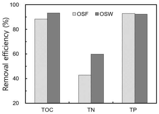 Removal efficiency for total organic carbon (TOC), total nitrogen (TN), and total phosphorus (TP) in the supernatant of washed water after filtration. The OSF samples were collected from a shucking site, while the OSW samples were collected from a fertilizer manufacturing plant.