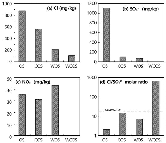 Changes in the Cl−, SO42−, and NO3− contents and the Cl/SO4 ratio with respect to the washing and calcination processes. “OS” represent oyster shells as-received without pretreatment, and the letters “C” and “W” in front of the “OS” indicate “Calcined” and “Washed”, respectively.