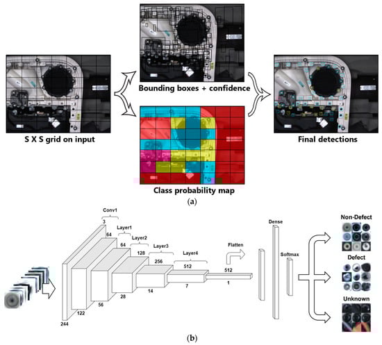 There are small, multiple points in each door trim that require heat staking. In fact, in this sample dataset, although the number of points varied among automobile types, each image had approximately over sixty points. Multiple object detection and recognition tasks are important topics in manufacturing. Figure 1a shows the outline of the model for applying YOLO to heat staking process inspection. If this study employed only the YOLO model, then for each input door trim image it would search for points and show bounding boxes with a confidence level. Final detection results would be shown accordingly. However, YOLO frameworks have shortcomings in identifying positions of multiple objects accurately. Furthermore, the accuracy of classifying multiple small objects is low, which also reduces the recall rate, ultimately causing problems with adopting YOLO models on real heat staking process sites. Figure 1b illustrates the outline of the classification model ResNet. If this study only employed the ResNet model to the problem, then it would be able to classify whether the door trim image was of a defect or not, but the classification model has difficulties in illustrating where the defect parts are. Thus, for industrial usage where the workers must understand where the defects are located, classification models are hard to use.